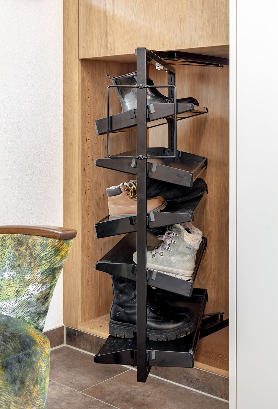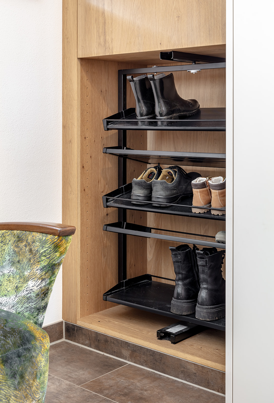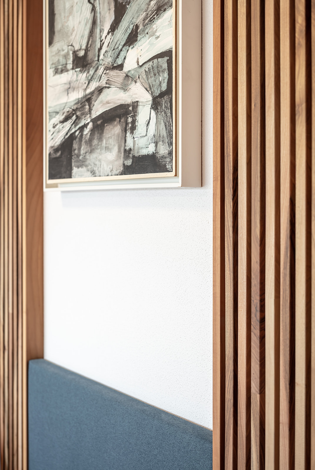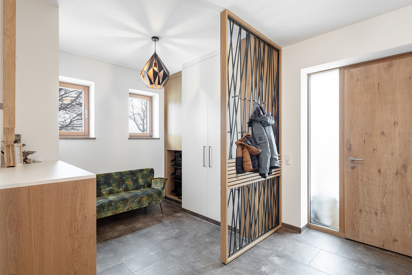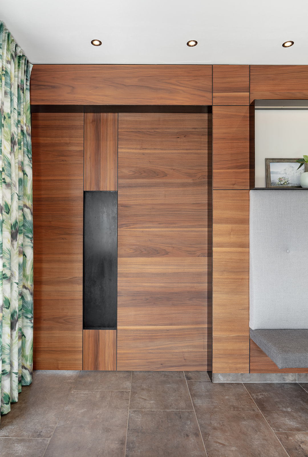 Im Wohnzimmer sind z.B. die Akustikelemente nicht nur funktional, sondern zugleich höchst dekorativ. Die Garderobe überzeugt mit durchdachten Lösungen und mit hochwertiger Ausführung. Unsere Türen wurden ebenfalls von Anton gefertigt. Zwei davon sind ganz besondere Exemplare: sie sind außergewöhnlich groß, mit raffinierten Details, funktional durchdacht und zugleich dekorativ.