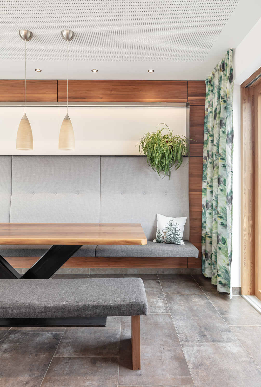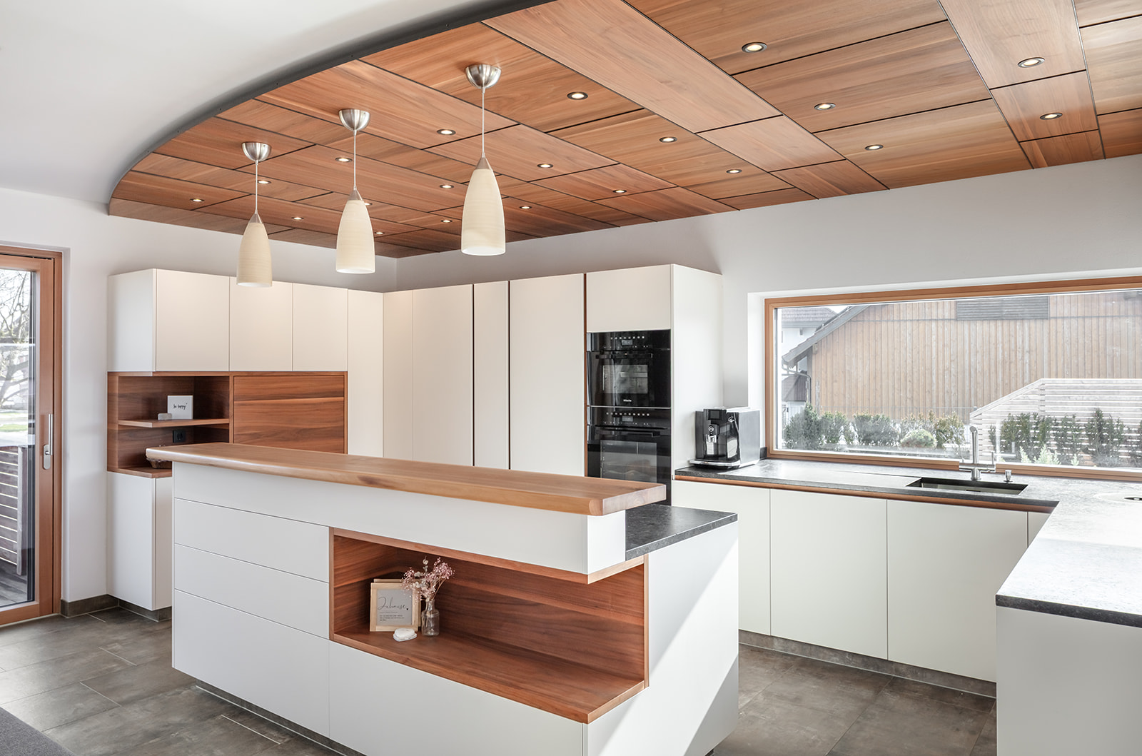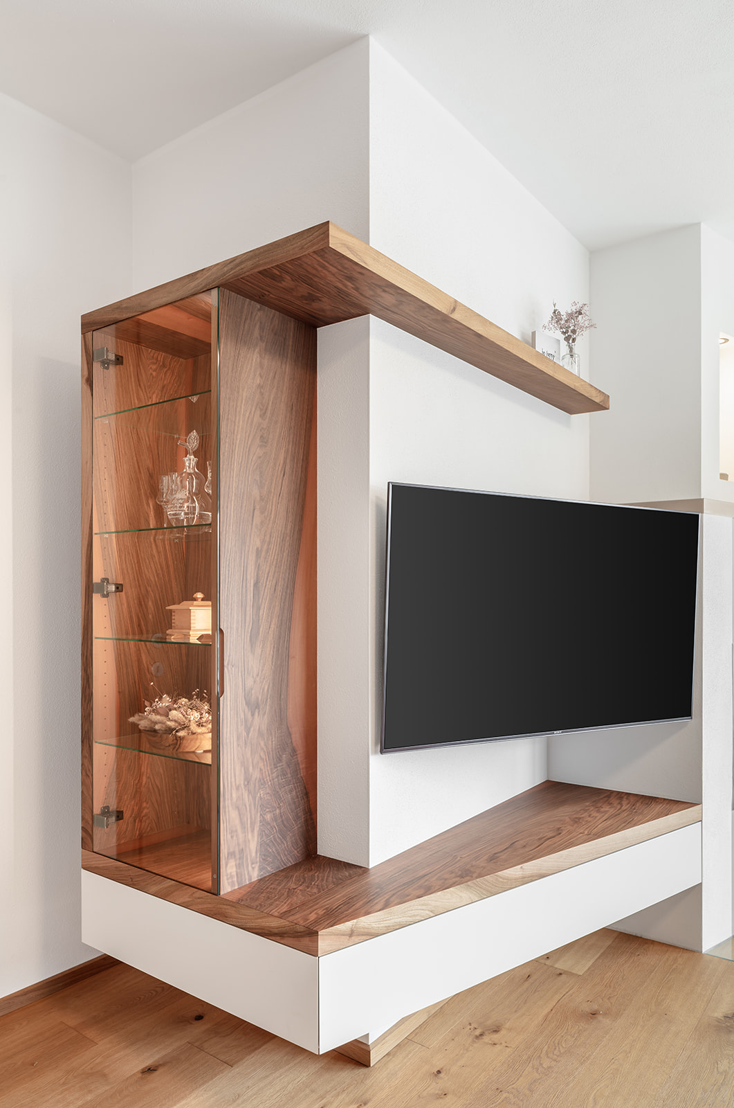 Wir sind dankbar, dass wir - auf Kundenwunsch - durchwegs sehr hochwertige Materialien verwenden konnten. Hervorzuheben ist die Traumküche mit freistehender Kochinsel und Baraufbau sowie ein ausladender Esstisch aus amerikanischem Nussholz sowie zahlreiche raffinierte Details wie z.B. eine minimalistische Glasvitrine in einem sich abstrakt einfügenden Sideboard u.v.a.m.