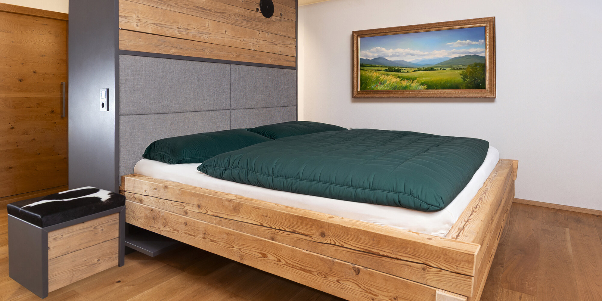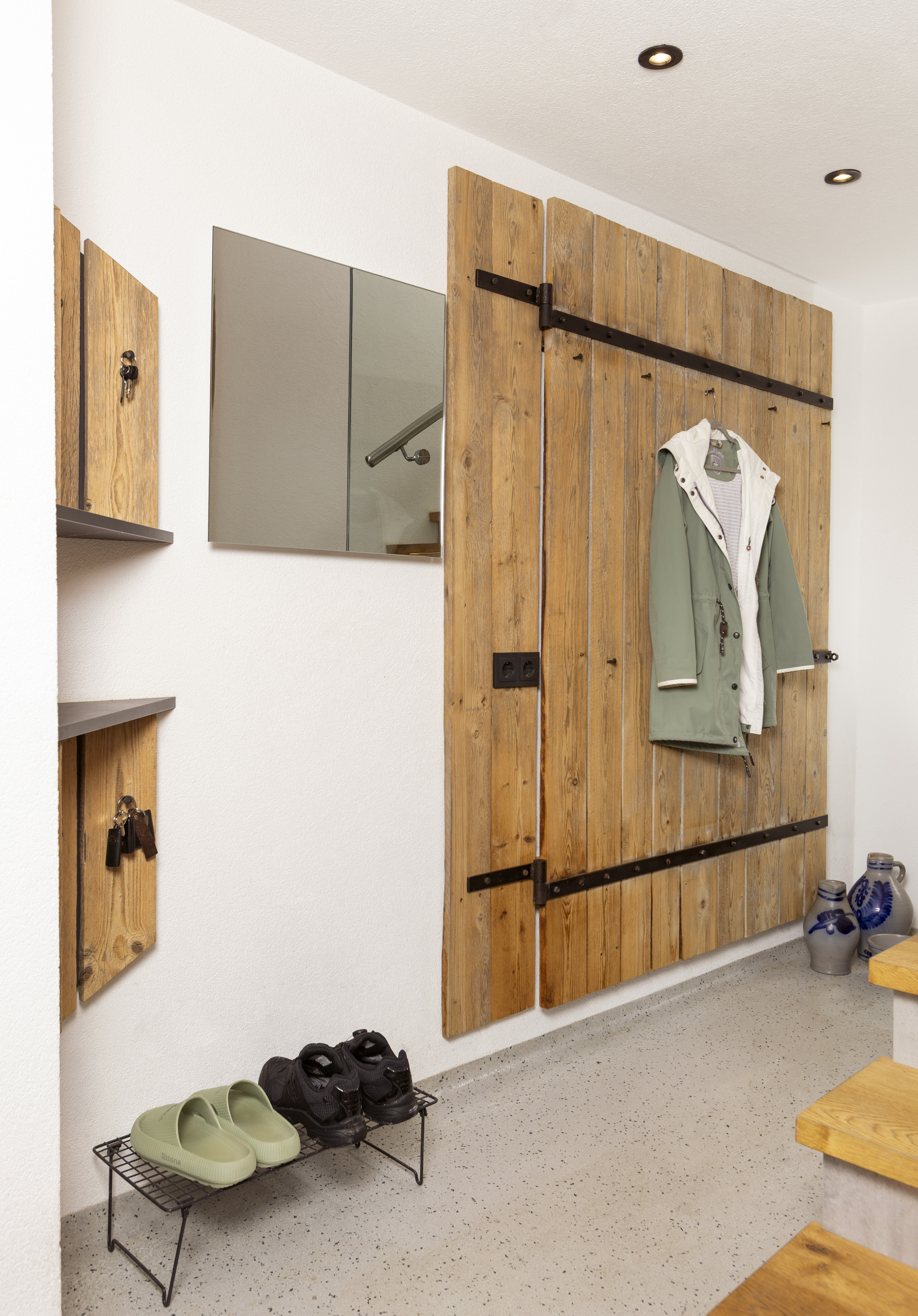 Symbiose aus alten, traditionellen Elementen mit modernen Formen und Materialien - passend zum bäuerlichen Betrieb: Rinderleder auf der Garderobenbank, handgeschmiedete Nägel als Garderobenhaken